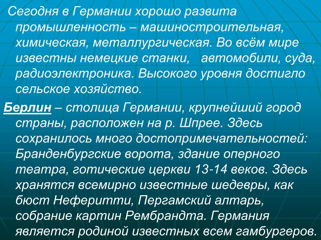 Сегодня в Германии хорошо развита промышленность – машиностроительная, химическая, металлургическая. Во всём мире известны немецкие станки, автомобили, суда, радиоэлектроника. Высокого уровня достигло сельское хозяйство. Берлин– столица Германии, крупнейший город страны, расположен на р. Шпрее. Здесь сохранилось много достопримечательностей: Бранденбургские ворота, здание оперного театра, готические церкви 13-14 веков. Здесь хранятся всемирно известные шедевры, как бюст Неферитти, Пергамский алтарь, собрание картин Рембрандта. Германия является родиной известных всем гамбургеров.
