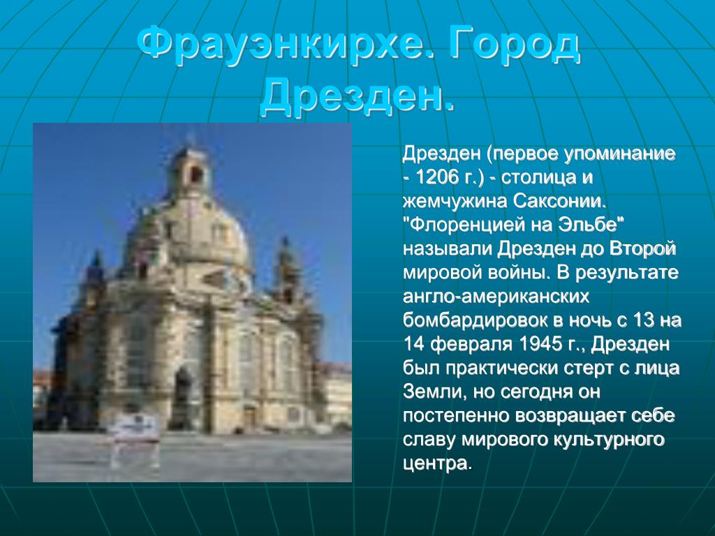 Фрауэнкирхе. Город Дрезден. Дрезден (первое упоминание - 1206 г.) - столица и жемчужина Саксонии. "Флоренцией на Эльбе" называли Дрезден до Второй мировой войны. В результате англо-американских бомбардировок в ночь с 13 на 14 февраля 1945 г., Дрезден был практически стерт с лица Земли, но сегодня он постепенно возвращает себе славу мирового культурного центра.