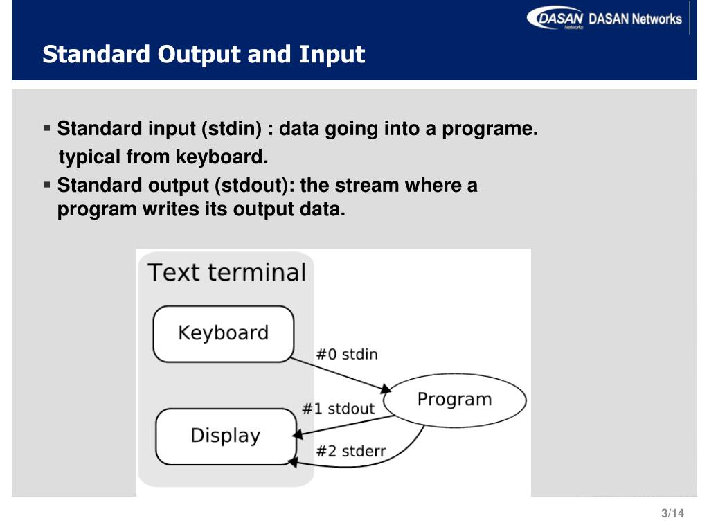 Standard Output and Input • Standard input (stdin) : data going into a programe. typical from keyboard. • Standard output (stdout): the stream where a program writes its output data.