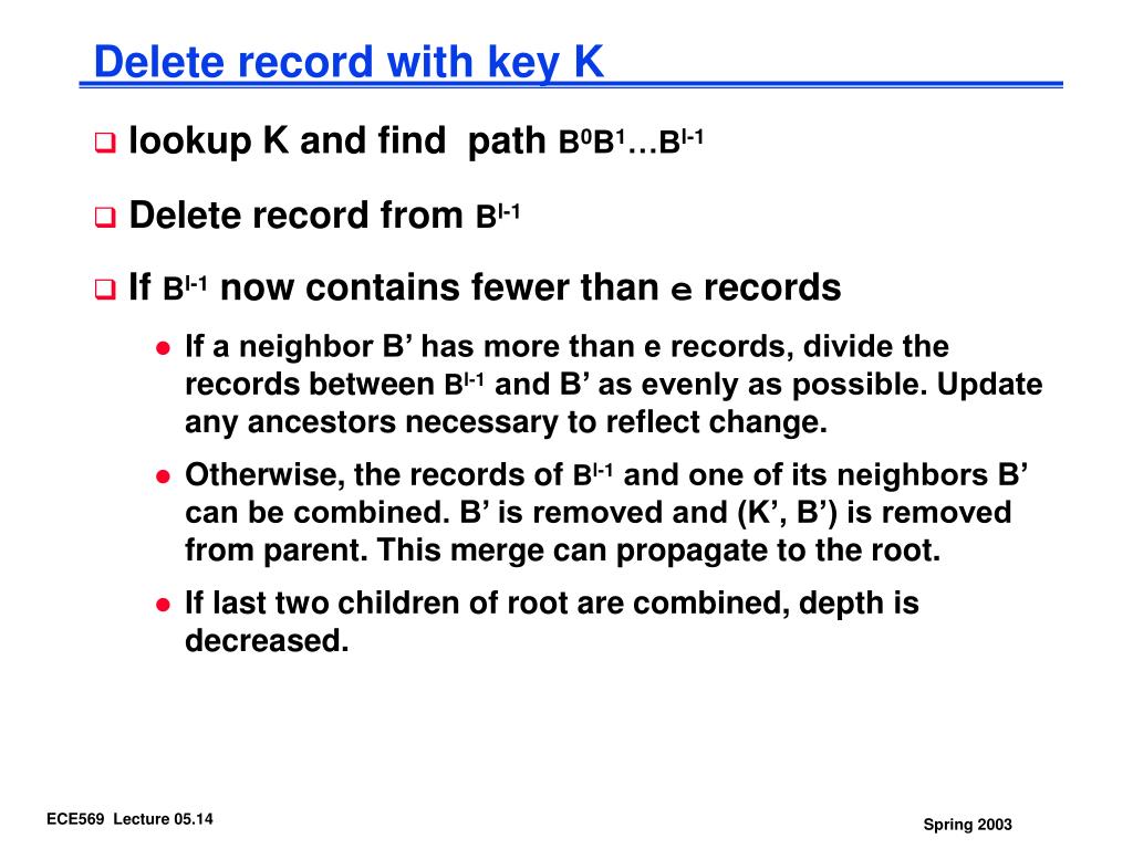 Delete record with key K • lookup K and find path B0B1…Bl-1 • Delete record from Bl-1 • If Bl-1 now contains fewer than e records • If a neighbor B’ has more than e records, divide the records between Bl-1 and B’ as evenly as possible. Update any ancestors necessary to reflect change. • Otherwise, the records of Bl-1 and one of its neighbors B’ can be combined. B’ is removed and (K’, B’) is removed from parent. This merge can propagate to the root. • If last two children of root are combined, depth is decreased.