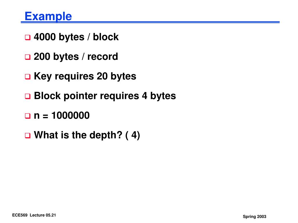 Example • 4000 bytes / block • 200 bytes / record • Key requires 20 bytes • Block pointer requires 4 bytes • n = 1000000 • What is the depth? ( 4)