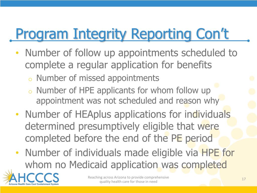 Program Integrity Reporting Con’t • Number of follow up appointments scheduled to complete a regular application for benefits • Number of missed appointments • Number of HPE applicants for whom follow up appointment was not scheduled and reason why • Number of HEAplus applications for individuals determined presumptively eligible that were completed before the end of the PE period • Number of individuals made eligible via HPE for whom no Medicaid application was completed Reaching across Arizona to provide comprehensive quality health care for those in need