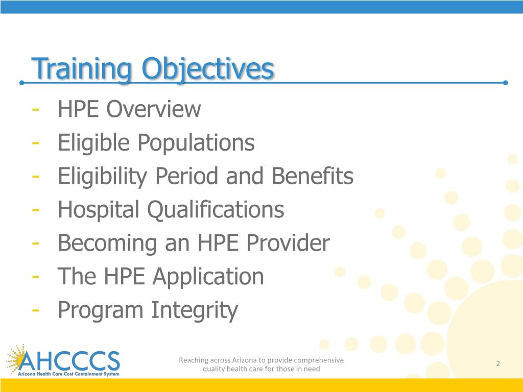 Training Objectives • HPE Overview • Eligible Populations • Eligibility Period and Benefits • Hospital Qualifications • Becoming an HPE Provider • The HPE Application • Program Integrity Reaching across Arizona to provide comprehensive quality health care for those in need