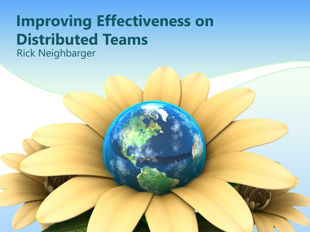 Improving Effectiveness on Distributed Teams. Rick Neighbarger. Improving Effectiveness on Distributed Teams. Distributed Team: Definition. Building a distributed team . 1. 2. 3. 5. 6. 7. Benefits. Leading a distributed team. Challenges. Working on/with a distributed team.