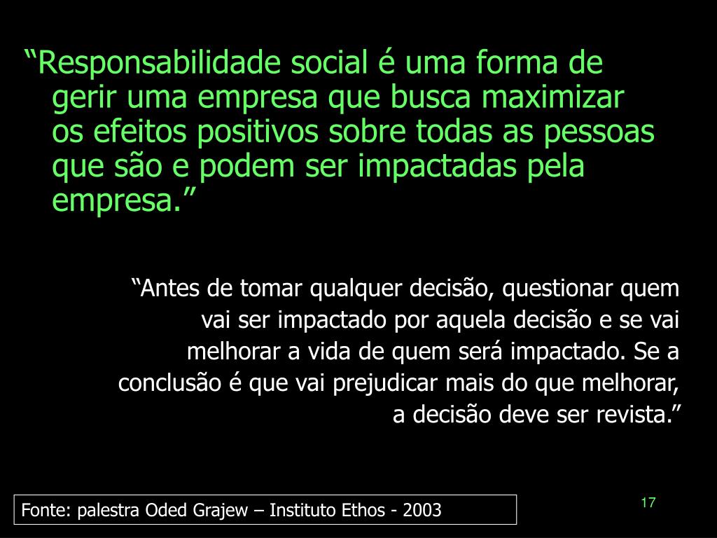 “Responsabilidade social é uma forma de gerir uma empresa que busca maximizar os efeitos positivos sobre todas as pessoas que são e podem ser impactadas pela empresa.” “Antes de tomar qualquer decisão, questionar quem vai ser impactado por aquela decisão e se vai melhorar a vida de quem será impactado. Se a conclusão é que vai prejudicar mais do que melhorar, a decisão deve ser revista.” Fonte: palestra Oded Grajew – Instituto Ethos - 2003