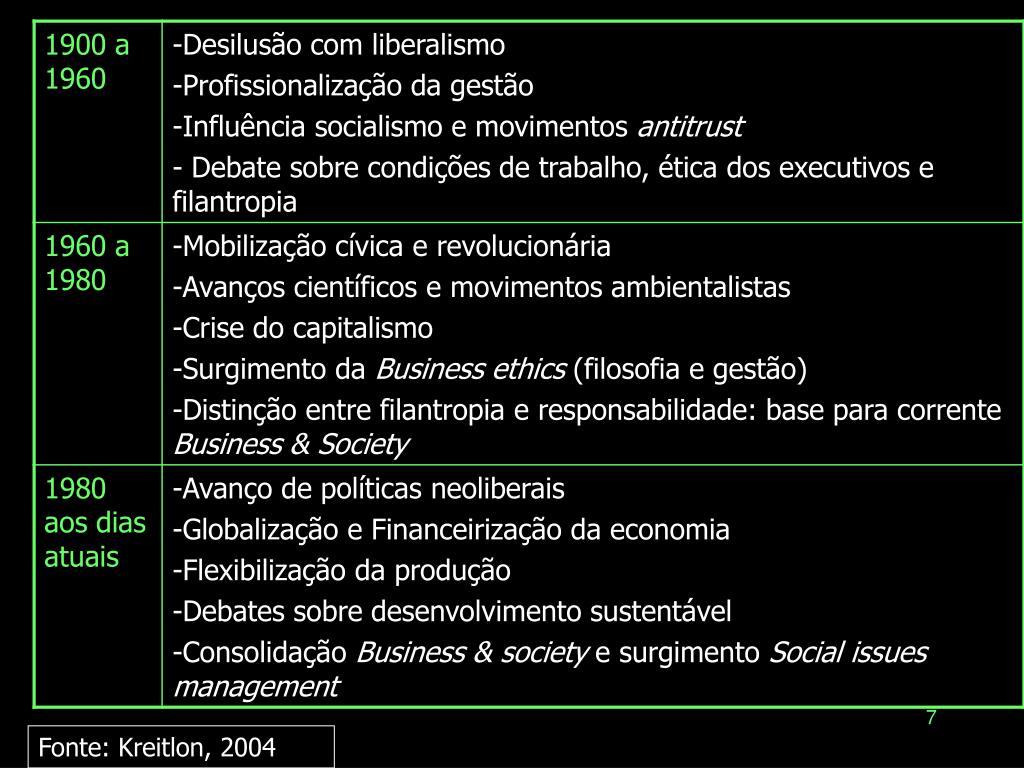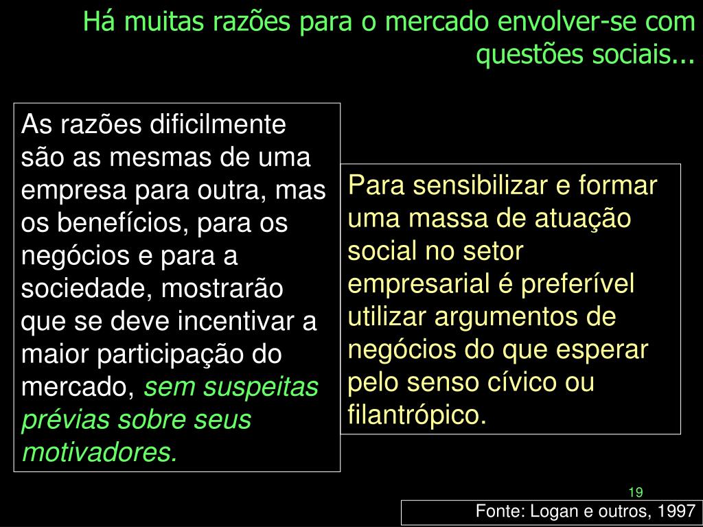 As razões dificilmente são as mesmas de uma empresa para outra, mas os benefícios, para os negócios e para a sociedade, mostrarão que se deve incentivar a maior participação do mercado, sem suspeitas prévias sobre seus motivadores. Há muitas razões para o mercado envolver-se com questões sociais... Para sensibilizar e formar uma massa de atuação social no setor empresarial é preferível utilizar argumentos de negócios do que esperar pelo senso cívico ou filantrópico. Fonte: Logan e outros, 1997