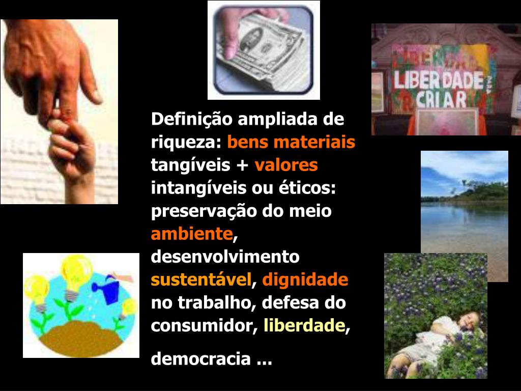 Definição ampliada de riqueza: bens materiais tangíveis + valores intangíveis ou éticos: preservação do meio ambiente, desenvolvimento sustentável, dignidade no trabalho, defesa do consumidor, liberdade, democracia ...