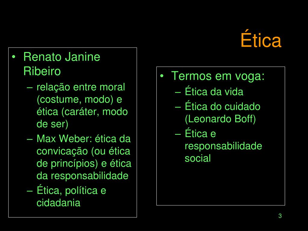 Renato Janine Ribeiro relação entre moral (costume, modo) e ética (caráter, modo de ser) Max Weber: ética da convicação (ou ética de princípios) e ética da responsabilidade Ética, política e cidadania Termos em voga: Ética da vida Ética do cuidado (Leonardo Boff) Ética e responsabilidade social Ética