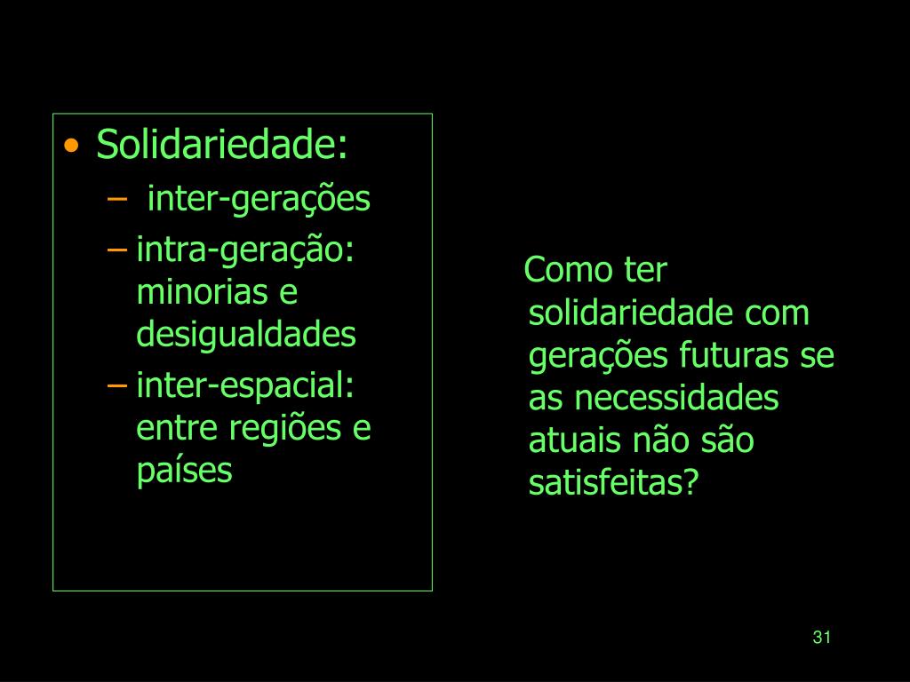 Como ter solidariedade com gerações futuras se as necessidades atuais não são satisfeitas? Solidariedade: inter-gerações intra-geração: minorias e desigualdades inter-espacial: entre regiões e países