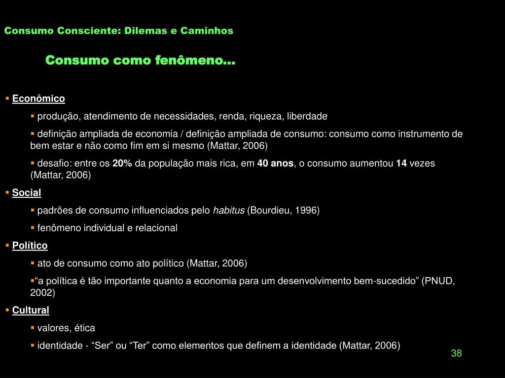 Consumo Consciente: Dilemas e Caminhos Consumo como fenômeno... • Econômico • produção, atendimento de necessidades, renda, riqueza, liberdade • definição ampliada de economia / definição ampliada de consumo: consumo como instrumento de bem estar e não como fim em si mesmo (Mattar, 2006) • desafio: entre os 20% da população mais rica, em 40 anos, o consumo aumentou 14 vezes (Mattar, 2006) • Social • padrões de consumo influenciados pelo habitus (Bourdieu, 1996) • fenômeno individual e relacional • Político • ato de consumo como ato político (Mattar, 2006) • “a política é tão importante quanto a economia para um desenvolvimento bem-sucedido” (PNUD, 2002) • Cultural • valores, ética • identidade - “Ser” ou “Ter” como elementos que definem a identidade (Mattar, 2006)