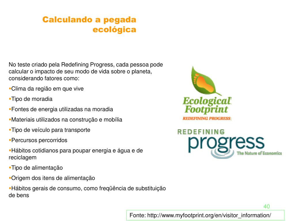 Calculando a pegada ecológica • No teste criado pela Redefining Progress, cada pessoa pode calcular o impacto de seu modo de vida sobre o planeta, considerando fatores como: • Clima da região em que vive • Tipo de moradia • Fontes de energia utilizadas na moradia • Materiais utilizados na construção e mobília • Tipo de veículo para transporte • Percursos percorridos • Hábitos cotidianos para poupar energia e água e de reciclagem • Tipo de alimentação • Origem dos itens de alimentação • Hábitos gerais de consumo, como freqüência de substituição de bens Fonte: http://www.myfootprint.org/en/visitor_information/