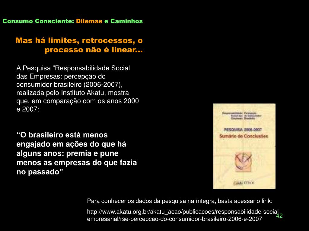 Consumo Consciente: Dilemas e Caminhos Mas há limites, retrocessos, o processo não é linear... A Pesquisa “Responsabilidade Social das Empresas: percepção do consumidor brasileiro (2006-2007), realizada pelo Instituto Akatu, mostra que, em comparação com os anos 2000 e 2007: “O brasileiro está menos engajado em ações do que há alguns anos: premia e pune menos as empresas do que fazia no passado” Para conhecer os dados da pesquisa na íntegra, basta acessar o link: http://www.akatu.org.br/akatu_acao/publicacoes/responsabilidade-social-empresarial/rse-percepcao-do-consumidor-brasileiro-2006-e-2007