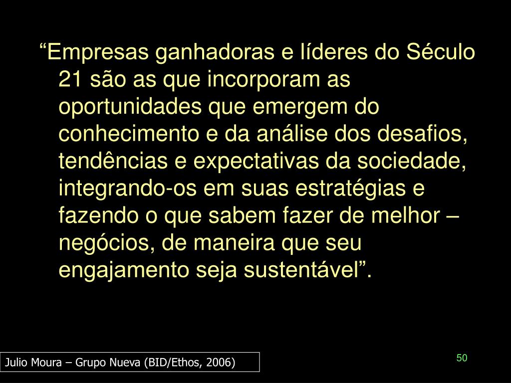 “Empresas ganhadoras e líderes do Século 21 são as que incorporam as oportunidades que emergem do conhecimento e da análise dos desafios, tendências e expectativas da sociedade, integrando-os em suas estratégias e fazendo o que sabem fazer de melhor – negócios, de maneira que seu engajamento seja sustentável”. Julio Moura – Grupo Nueva (BID/Ethos, 2006)