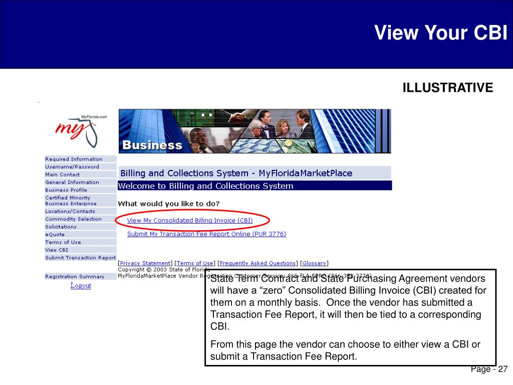 View Your CBI ILLUSTRATIVE State Term Contract and State Purchasing Agreement vendors will have a “zero” Consolidated Billing Invoice (CBI) created for them on a monthly basis. Once the vendor has submitted a Transaction Fee Report, it will then be tied to a corresponding CBI. From this page the vendor can choose to either view a CBI or submit a Transaction Fee Report.