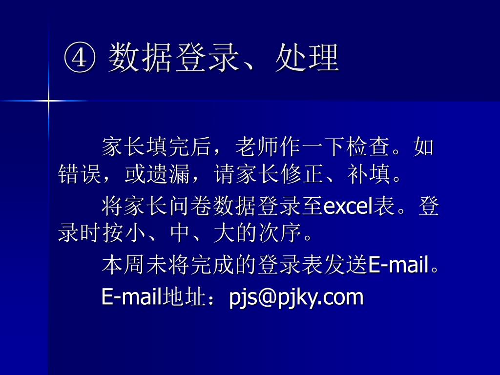 ④ 数据登录、处理 家长填完后,老师作一下检查。如错误,或遗漏,请家长修正、补填。 将家长问卷数据登录至excel表。登录时按小、中、大的次序。 本周未将完成的登录表发送E-mail。 E-mail地址:pjs@pjky.com