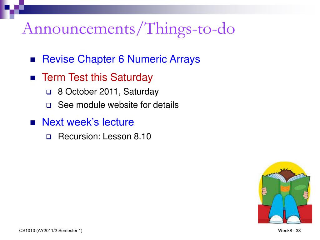 Announcements/Things-to-do • Revise Chapter 6 Numeric Arrays • Term Test this Saturday • 8 October 2011, Saturday • See module website for details • Next week’s lecture • Recursion: Lesson 8.10 CS1010 (AY2011/2 Semester 1)