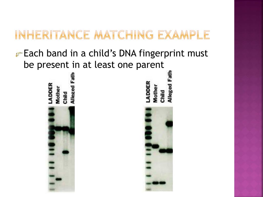 inheritance Matching Example • Each band in a child’s DNA fingerprint must be present in at least one parent