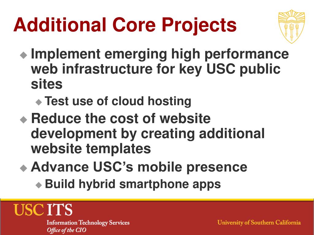 Additional Core Projects • Implement emerging high performance web infrastructure for key USC public sites • Test use of cloud hosting • Reduce the cost of website development by creating additional website templates • Advance USC’s mobile presence • Build hybrid smartphone apps