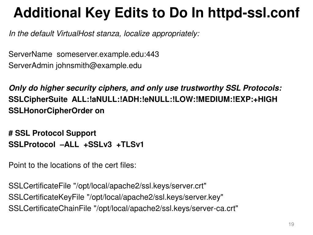 Additional Key Edits to Do In httpd-ssl.conf In the default VirtualHost stanza, localize appropriately: ServerName someserver.example.edu:443 ServerAdmin johnsmith@example.edu Only do higher security ciphers, and only use trustworthy SSL Protocols: SSLCipherSuite ALL:!aNULL:!ADH:!eNULL:!LOW:!MEDIUM:!EXP:+HIGH SSLHonorCipherOrder on # SSL Protocol Support SSLProtocol –ALL +SSLv3 +TLSv1 Point to the locations of the cert files: SSLCertificateFile "/opt/local/apache2/ssl.keys/server.crt" SSLCertificateKeyFile "/opt/local/apache2/ssl.keys/server.key" SSLCertificateChainFile "/opt/local/apache2/ssl.keys/server-ca.crt"