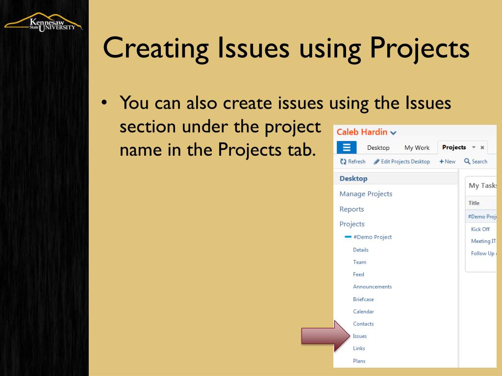 Creating Issues using Projects • You can also create issues using the Issues section under the projectname in the Projects tab.