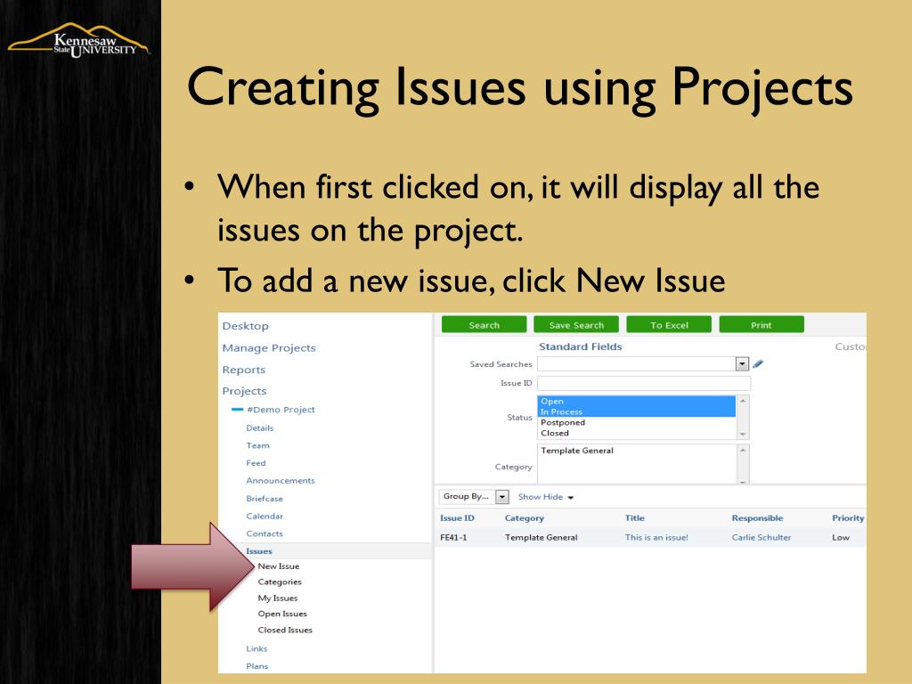Creating Issues using Projects • When first clicked on, it will display all the issues on the project. • To add a new issue, click New Issue