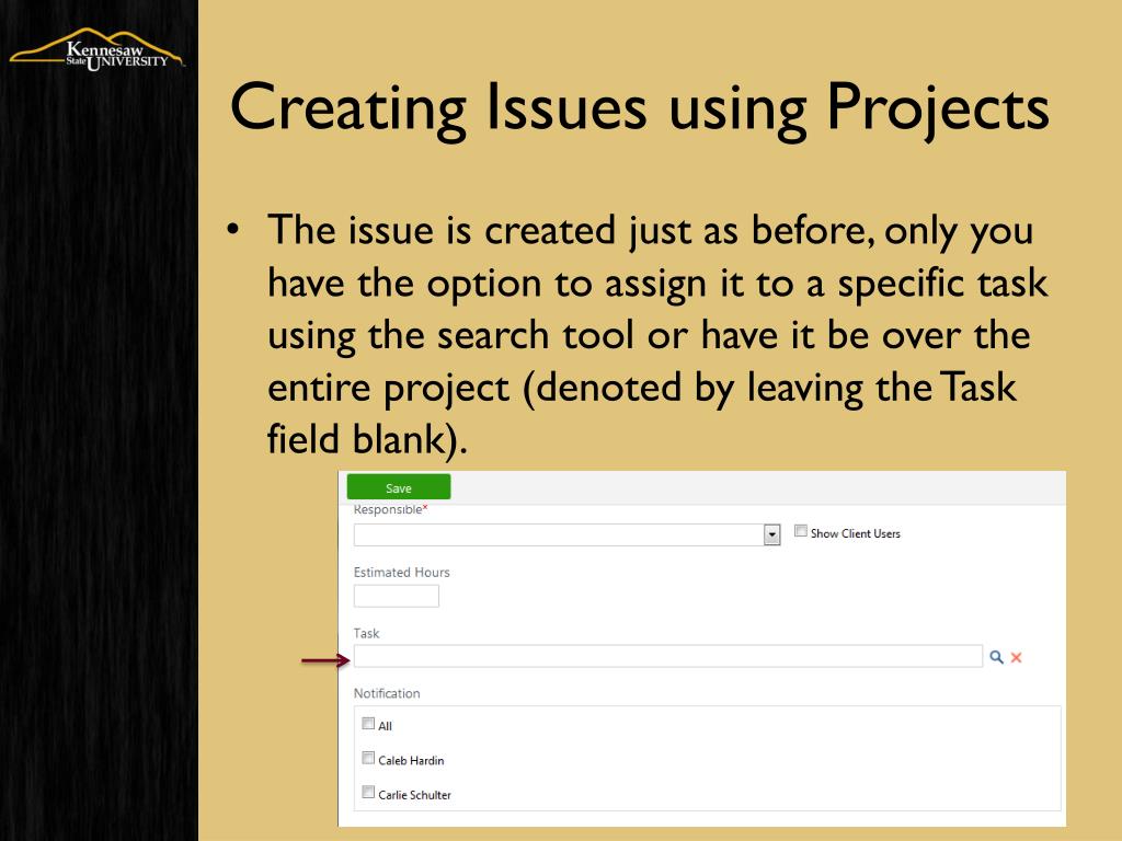 Creating Issues using Projects • The issue is created just as before, only you have the option to assign it to a specific task using the search tool or have it be over the entire project (denoted by leaving the Task field blank).