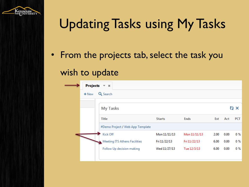 Updating Tasks using My Tasks • From the projects tab, select the task you wish to update
