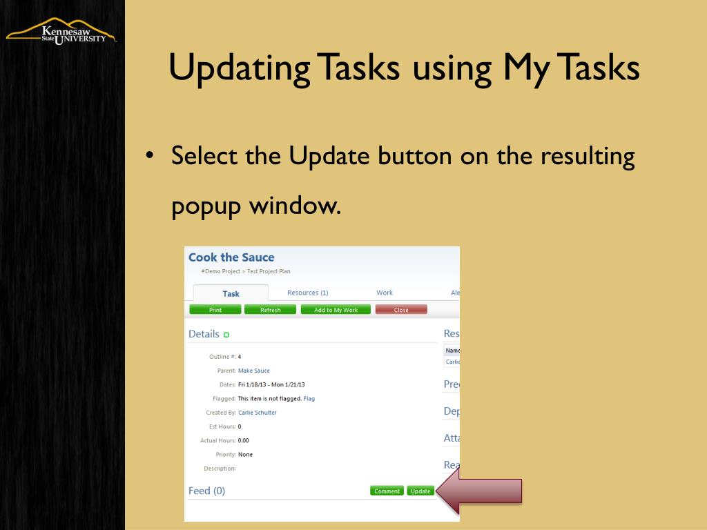 Updating Tasks using My Tasks • Select the Update button on the resulting popup window.