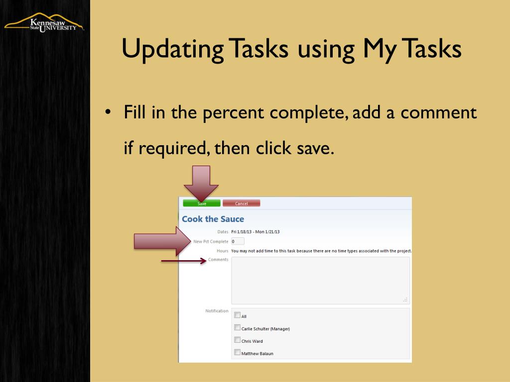 Updating Tasks using My Tasks • Fill in the percent complete, add a comment if required, then click save.