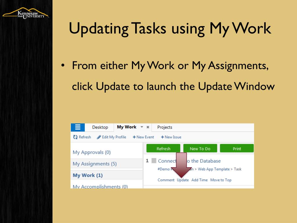 Updating Tasks using My Work • From either My Work or My Assignments, click Update to launch the Update Window