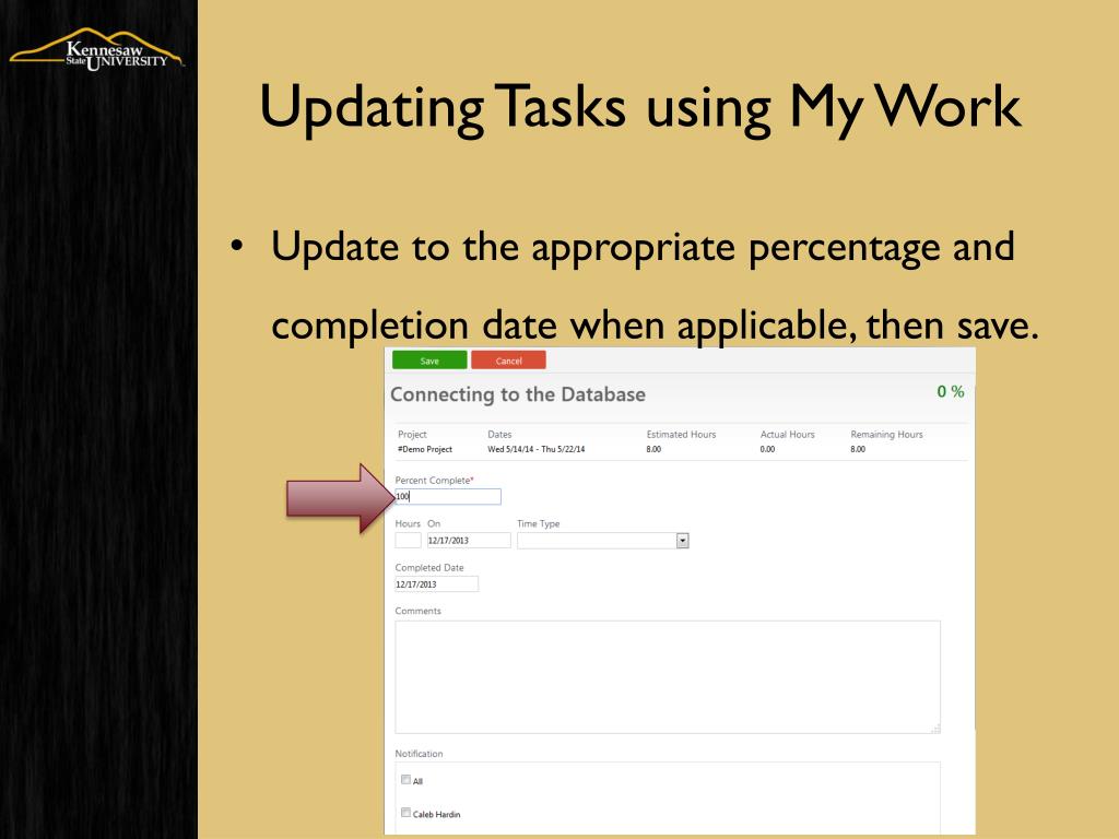 Updating Tasks using My Work • Update to the appropriate percentage and completion date when applicable, then save.
