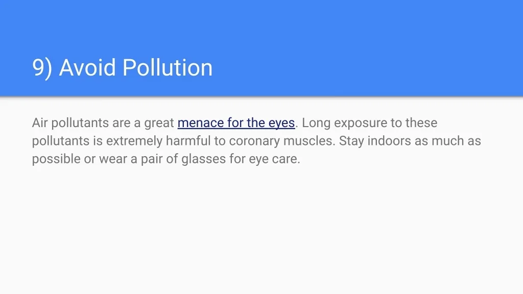 9) Avoid Pollution Air pollutants are a great menace for the eyes. Long exposure to these pollutants is extremely harmful to coronary muscles. Stay indoors as much as possible or wear a pair of glasses for eye care.