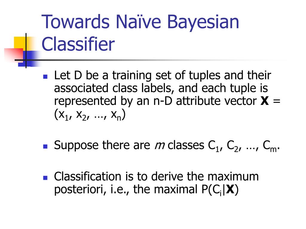 Towards Naïve Bayesian Classifier • Let D be a training set of tuples and their associated class labels, and each tuple is represented by an n-D attribute vector X = (x1, x2, …, xn) • Suppose there are m classes C1, C2, …, Cm. • Classification is to derive the maximum posteriori, i.e., the maximal P(Ci|X)