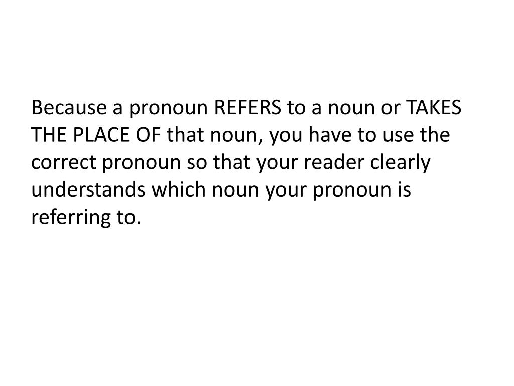 Because a pronoun REFERS to a noun or TAKES THE PLACE OF that noun, you have to use the correct pronoun so that your reader clearly understands which noun your pronoun is referring to.