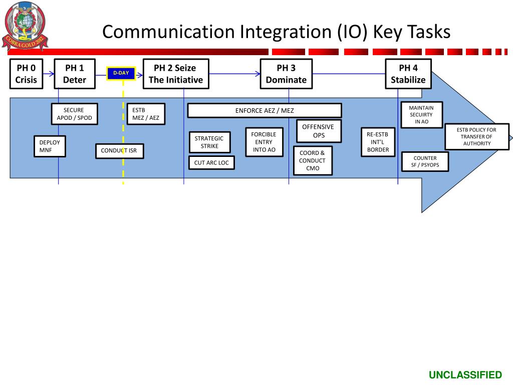 Communication Integration (IO) Key Tasks PH 0 Crisis PH 1 Deter PH 2 Seize The Initiative PH 3 Dominate PH 4 Stabilize D-DAY MAINTAIN SECUIRTY IN AO SECURE APOD / SPOD ESTB MEZ / AEZ ENFORCE AEZ / MEZ OFFENSIVE OPS ESTB POLICY FOR TRANSFER OF AUTHORITY FORCIBLE ENTRY INTO AO RE-ESTB INT’L BORDER STRATEGIC STRIKE DEPLOY MNF CONDUCT ISR COORD & CONDUCT CMO COUNTER SF / PSYOPS CUT ARC LOC
