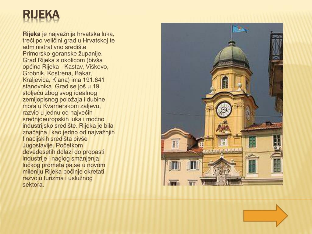 Rijeka je najvažnija hrvatska luka, treći po veličini grad u Hrvatskoj te administrativno središte Primorsko-goranske županije. Grad Rijeka s okolicom (bivša općina Rijeka - Kastav, Viškovo, Grobnik, Kostrena, Bakar, Kraljevica, Klana) ima 191.641 stanovnika. Grad se još u 19. stoljeću zbog svog idealnog zemljopisnog položaja i dubine mora u Kvarnerskom zaljevu, razvio u jednu od najvećih srednjoeuropskih luka i moćno industrijsko središte. Rijeka je bila značajna i kao jedno od najvažnjihfinacijskih središta bivše Jugoslavije. Početkom devedesetih dolazi do propasti industrije i naglog smanjenja lučkog prometa pa se u novom mileniju Rijeka počinje okretati razvoju turizma i uslužnog sektora. Rijeka