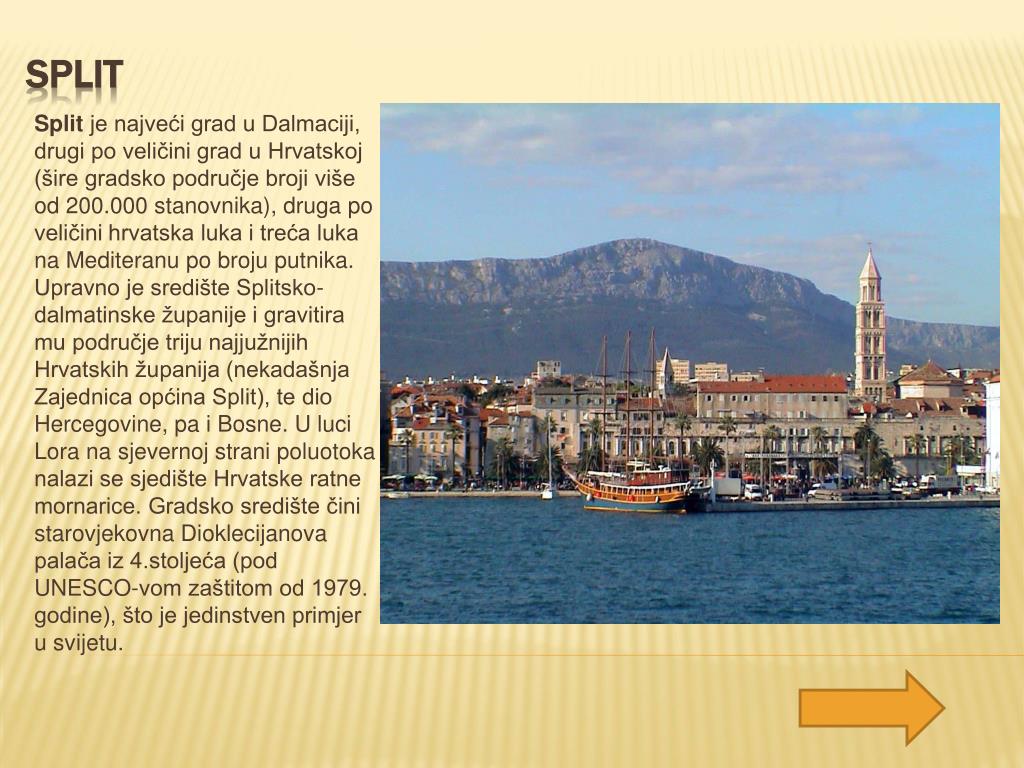 Split je najveći grad u Dalmaciji, drugi po veličini grad u Hrvatskoj (šire gradsko područje broji više od 200.000 stanovnika), druga po veličini hrvatska luka i treća luka na Mediteranu po broju putnika. Upravno je središte Splitsko-dalmatinske županije i gravitira mu područje triju najjužnijih Hrvatskih županija (nekadašnja Zajednica općina Split), te dio Hercegovine, pa i Bosne. U luci Lora na sjevernoj strani poluotoka nalazi se sjedište Hrvatske ratne mornarice. Gradsko središte čini starovjekovna Dioklecijanova palača iz 4.stoljeća (pod UNESCO-vom zaštitom od 1979. godine), što je jedinstven primjer u svijetu. Split
