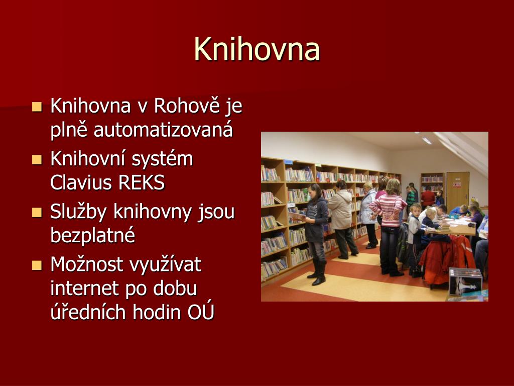 Knihovna • Knihovna v Rohově je plně automatizovaná • Knihovní systém Clavius REKS • Služby knihovny jsou bezplatné • Možnost využívat internet po dobu úředních hodin OÚ