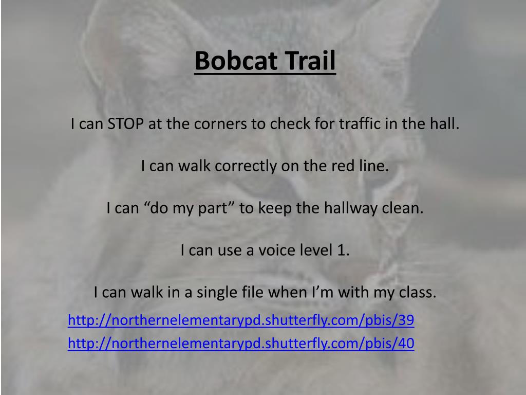 Bobcat TrailI can STOP at the corners to check for traffic in the hall.I can walk correctly on the red line.I can “do my part” to keep the hallway clean.I can use a voice level 1.I can walk in a single file when I’m with my class. http://northernelementarypd.shutterfly.com/pbis/39 http://northernelementarypd.shutterfly.com/pbis/40
