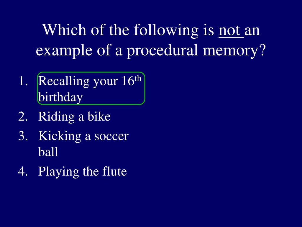 Which of the following is not an example of a procedural memory? • Recalling your 16th birthday • Riding a bike • Kicking a soccer ball • Playing the flute