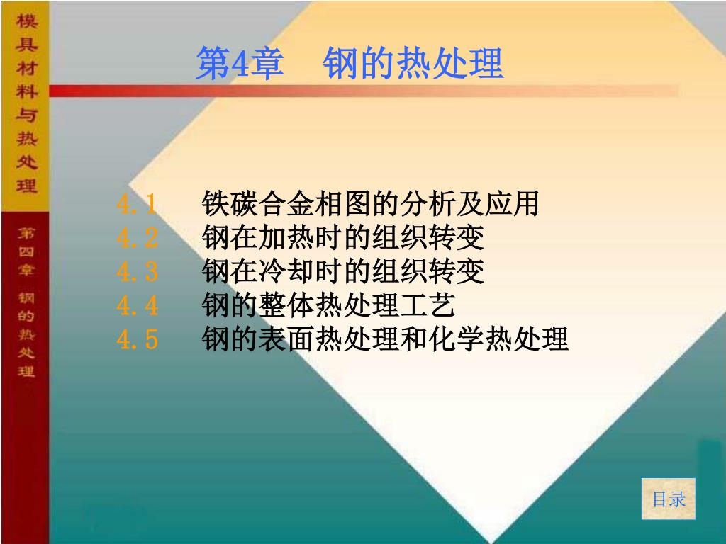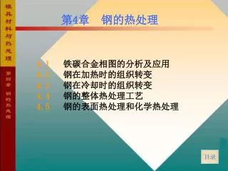 第4章 钢的热处理 4.1铁碳合金相图的分析及应用 4.2钢在加热时的组织转变 4.3钢在冷却时的组织转变 4.4钢的整体热处理工艺 4.5钢的表面热处理和化学热处理 目录