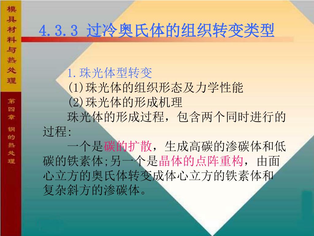 4.3.3 过冷奥氏体的组织转变类型 1.珠光体型转变 (1)珠光体的组织形态及力学性能 (2)珠光体的形成机理 珠光体的形成过程,包含两个同时进行的过程: 一个是碳的扩散,生成高碳的渗碳体和低碳的铁素体;另一个是晶体的点阵重构,由面心立方的奥氏体转变成体心立方的铁素体和 复杂斜方的渗碳体。