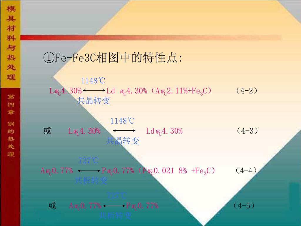 ①Fe-Fe3C相图中的特性点: 1148℃ LwC4.30% Ld wC4.30%(AwC2.11%+Fe3C) (4-2) 共晶转变 1148℃ 或 LwC4.30% LdwC4.30%(4-3) 共晶转变 727℃ AwC0.77% PwC0.77%(FwC0.021 8% +Fe3C) (4-4) 共析转变 727℃ 或 AwC0.77% PwC0.77%(4-5) 共析转变