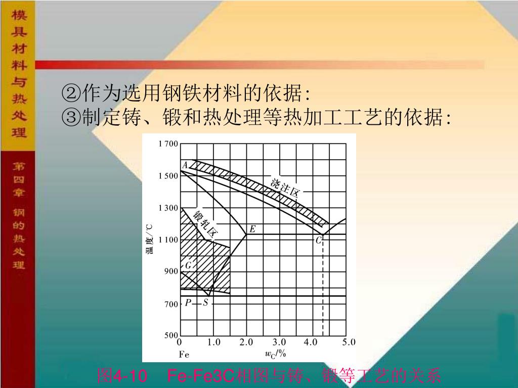 ②作为选用钢铁材料的依据: ③制定铸、锻和热处理等热加工工艺的依据: 图4-10 Fe-Fe3C相图与铸、锻等工艺的关系