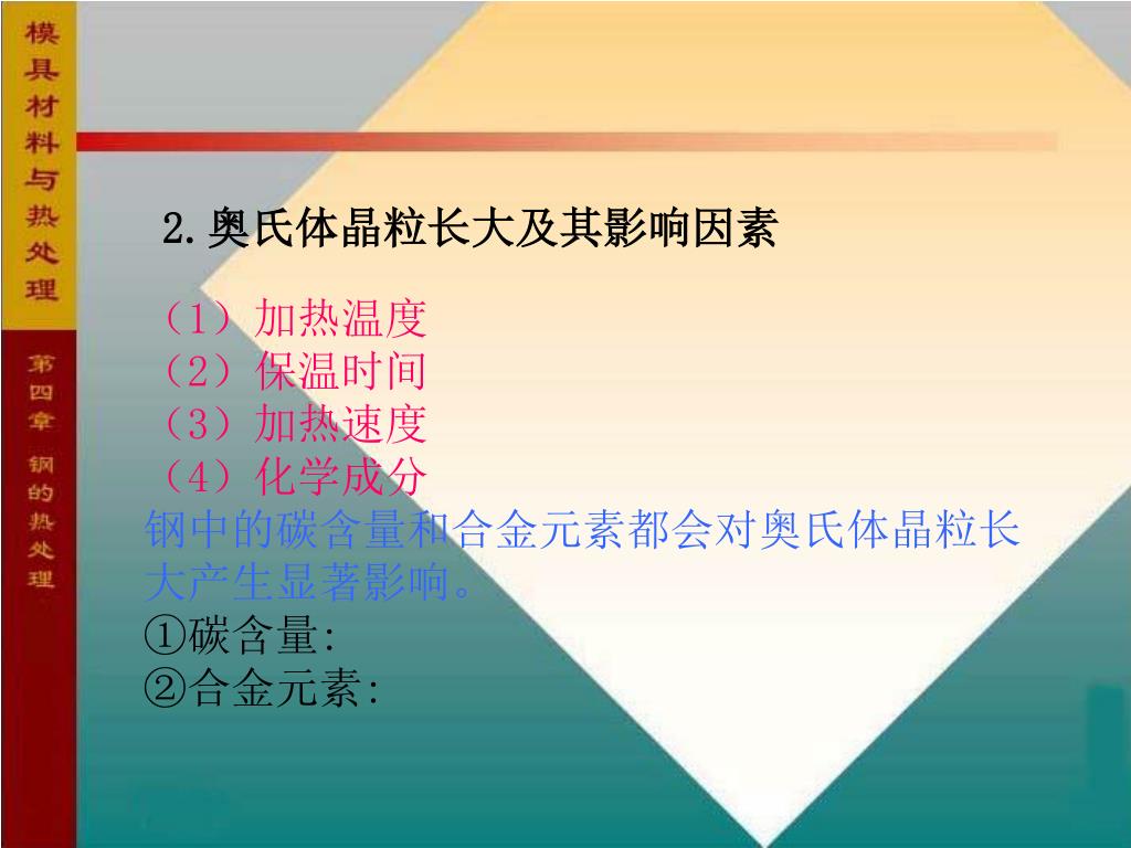 2.奥氏体晶粒长大及其影响因素 (1)加热温度 (2)保温时间 (3)加热速度 (4)化学成分 钢中的碳含量和合金元素都会对奥氏体晶粒长大产生显著影响。 ①碳含量: ②合金元素: