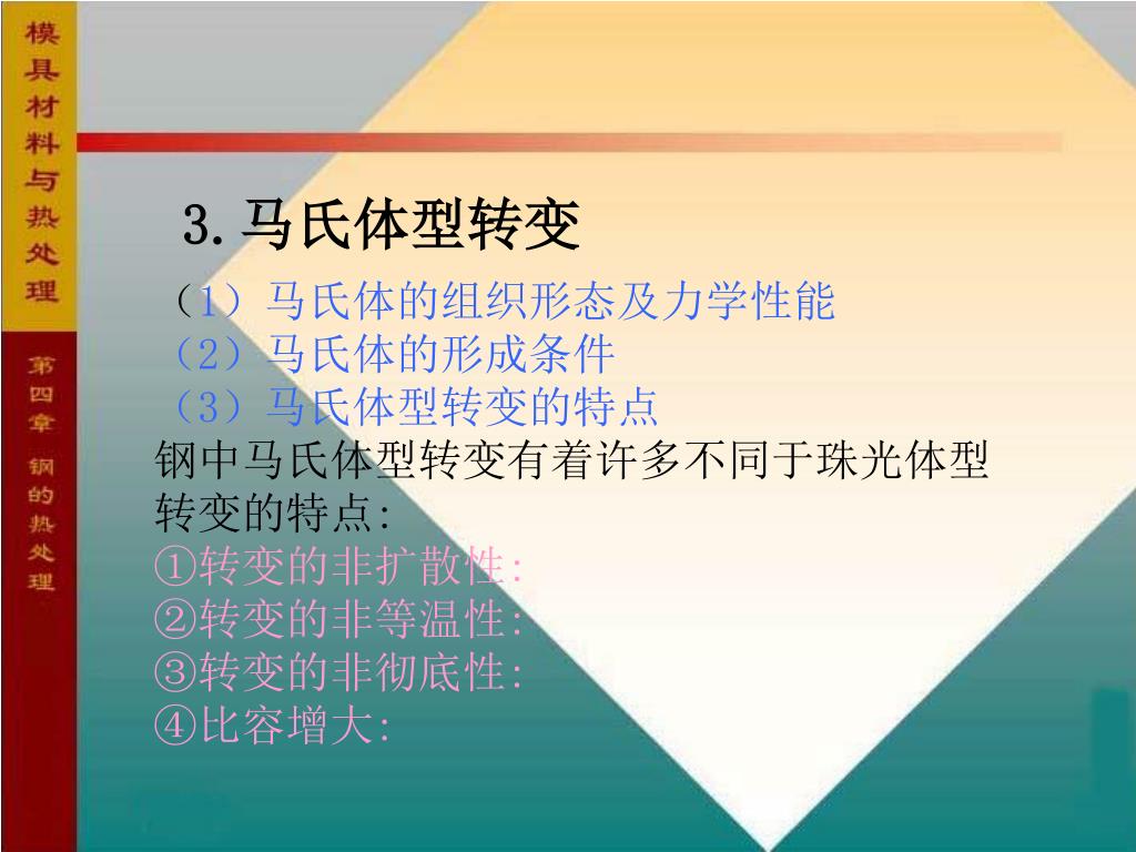 3.马氏体型转变 (1)马氏体的组织形态及力学性能 (2)马氏体的形成条件 (3)马氏体型转变的特点 钢中马氏体型转变有着许多不同于珠光体型转变的特点: ①转变的非扩散性: ②转变的非等温性: ③转变的非彻底性: ④比容增大: