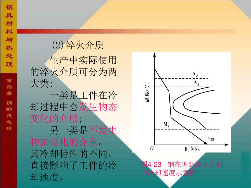 (2)淬火介质 生产中实际使用的淬火介质可分为两大类: 一类是工件在冷却过程中会发生物态变化的介质; 另一类是不发生物态变化的介质。 其冷却特性的不同,直接影响了工件的冷却速度。 图4-23 钢在理想淬火介质中冷却速度示意图