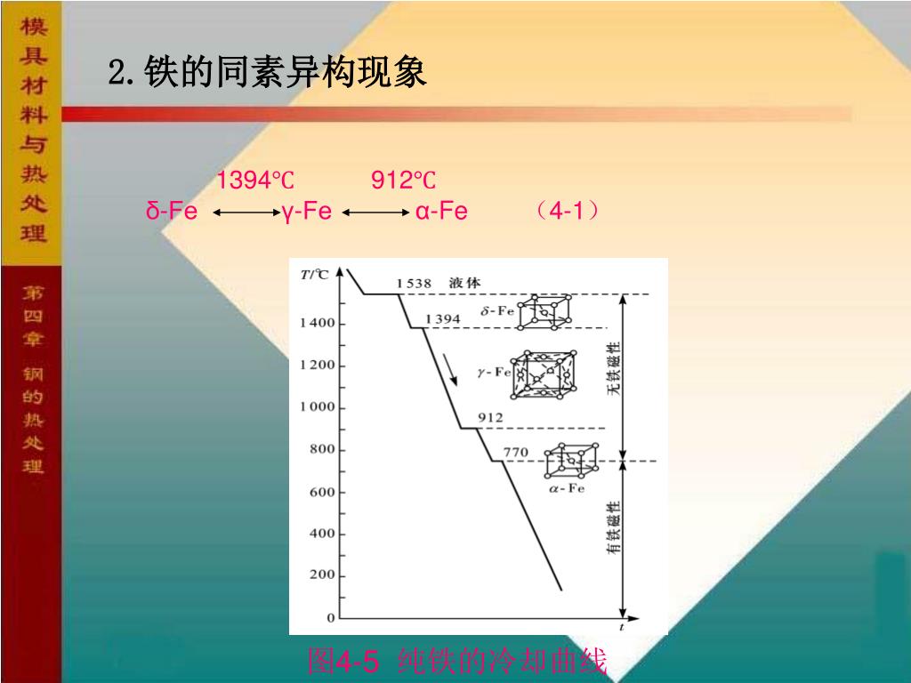 2.铁的同素异构现象 1394℃ 912℃ δ-Fe γ-Fe α-Fe (4-1) 图4-5 纯铁的冷却曲线