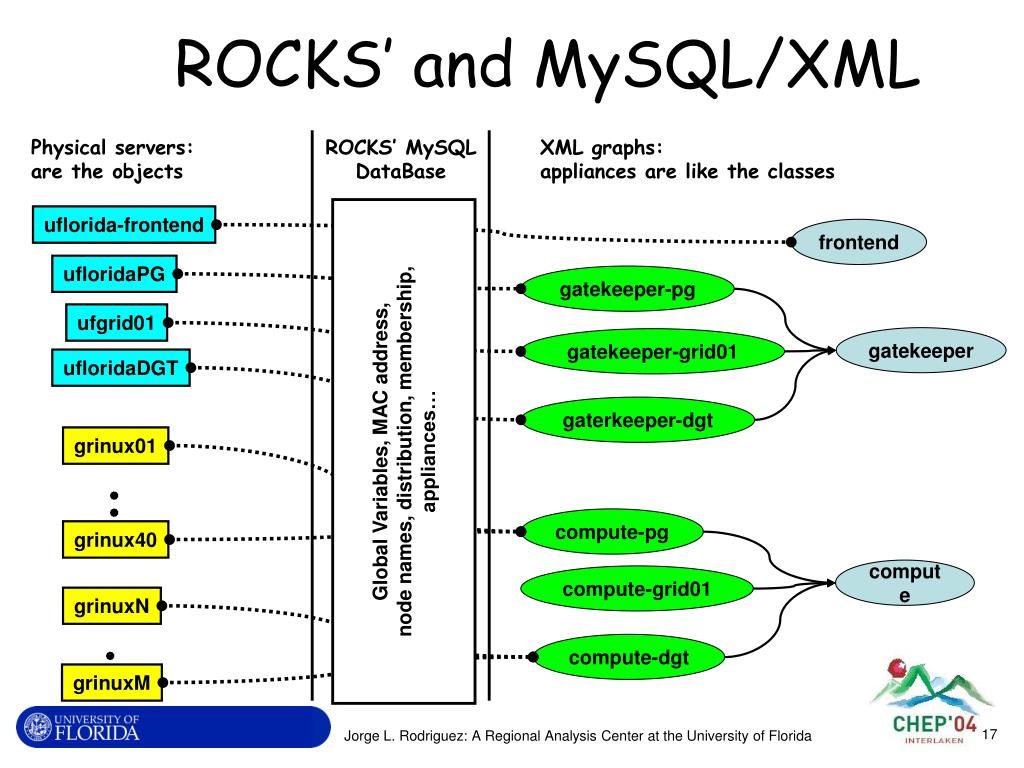 ROCKS’ and MySQL/XML Physical servers: are the objects ROCKS’ MySQL DataBase XML graphs: appliances are like the classes Global Variables, MAC address, node names, distribution, membership, appliances… uflorida-frontend frontend ufloridaPG gatekeeper-pg ufgrid01 gatekeeper gatekeeper-grid01 ufloridaDGT gaterkeeper-dgt grinux01 compute-pg grinux40 compute compute-grid01 grinuxN compute-dgt grinuxM Jorge L. Rodriguez: A Regional Analysis Center at the University of Florida