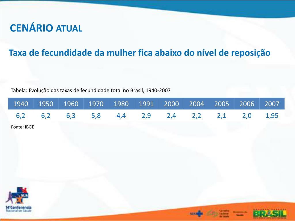 CENÁRIO ATUAL Taxa de fecundidade da mulher fica abaixo do nível de reposição Tabela: Evolução das taxas de fecundidade total no Brasil, 1940-2007 Fonte: IBGE